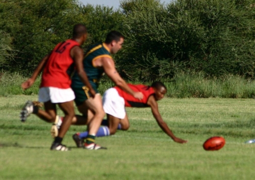 The match was again played in good spirits, but the North West Province boys certainly had more experience than Gauteng, so the Aussies had to focus better on the game. Notet that inter-Provincial matches are not often played, so for all 3 games the locals have been wearing the same red and black jumpers. The match was held in hot conditions at the University grounds in Mafikeng, and again the oval was good for Australian Rules football. With a PA system running with commentary, the game had a good atmosphere.